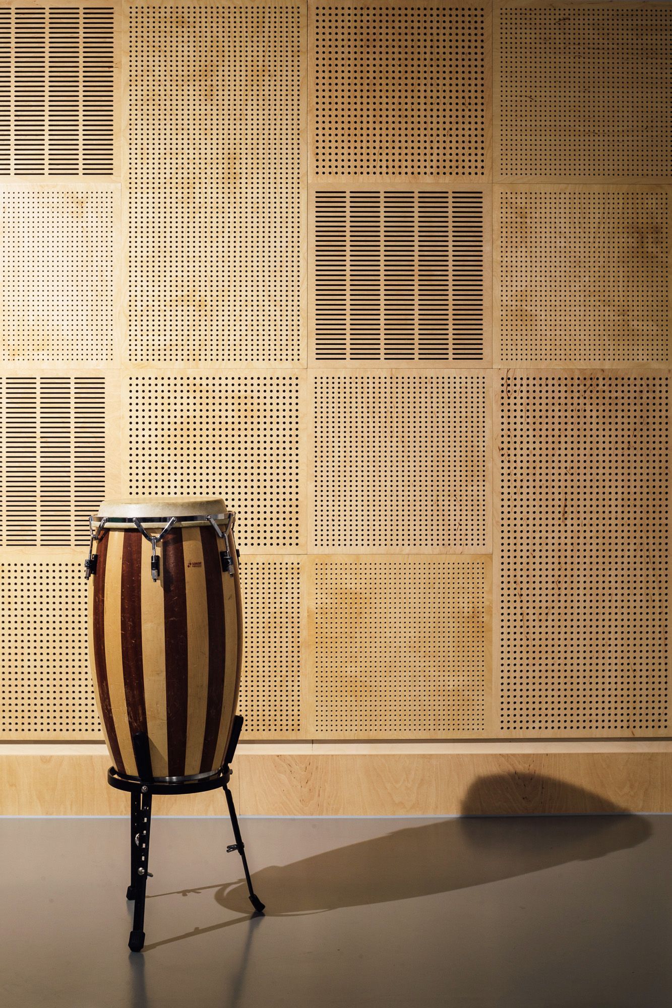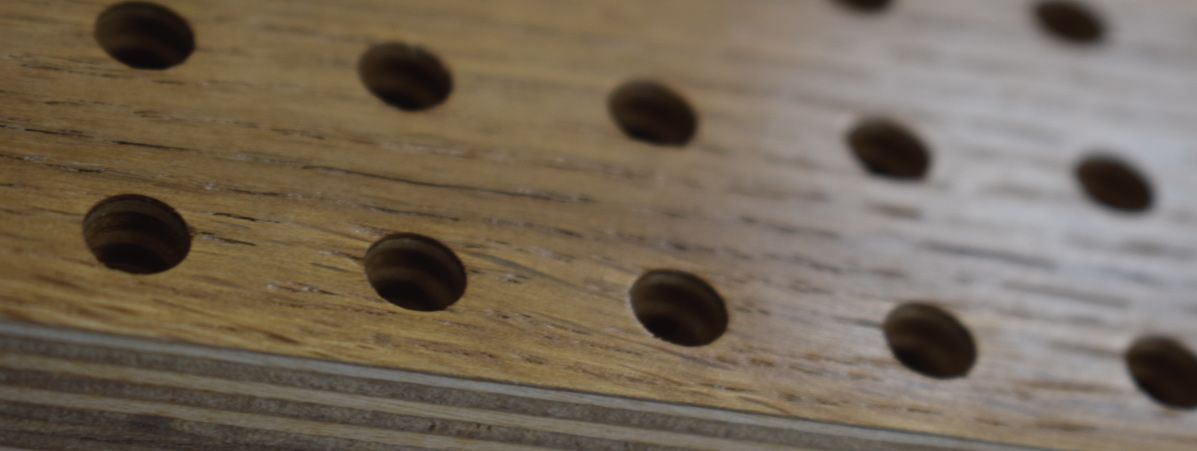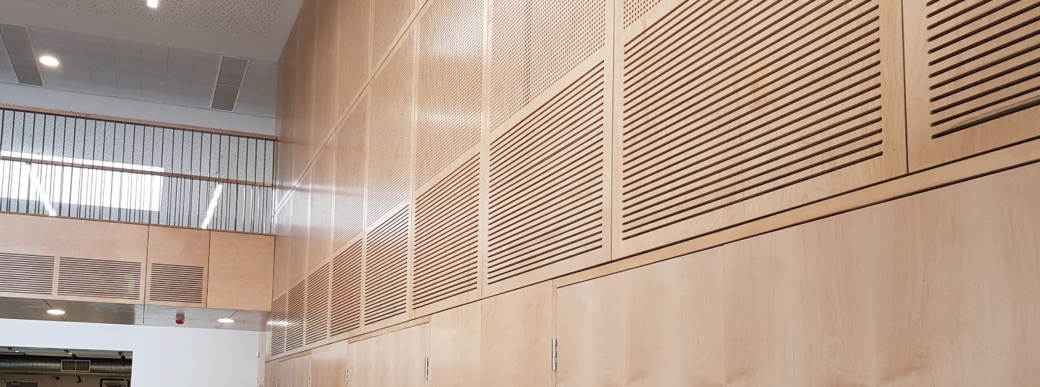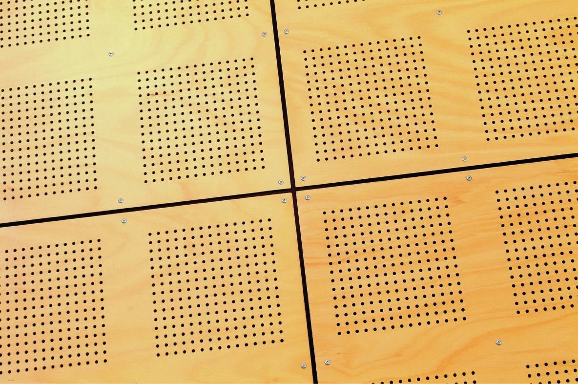 perforated plywood wall panels are installed in front of a void containing acoustic wool. Soundwaves pass through the panels and are absorbed, which helps control the acoustic environment in a room. Available in a range of perforation sizes and panel finishes. Suitable for gymnasiums, theatres, auditoriums, airports or any large space.